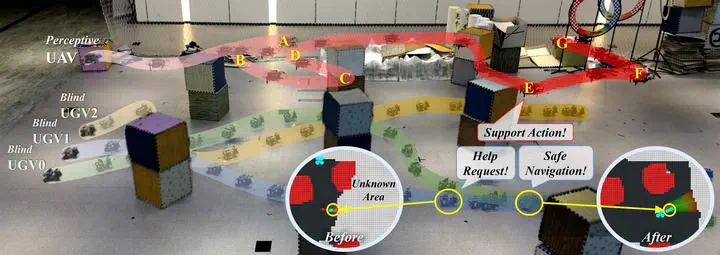 Perception is necessary for autonomous navigation in an unknown area crowded with obstacles. It’s challenging for a robot to navigate safely without any sensors that can sense the environment, resulting in a blind robot, and becomes more difficult when comes to a group of robots. However, it could be costly to equip all robots with expensive perception or SLAM systems. In this paper, we propose a novel system named ColAG, to solve the problem of autonomous navigation for a group of blind UGVs by introducing cooperation with one UAV, which is the only robot that has full perception capabilities in the group. The UAV uses SLAM for its odometry and mapping while sharing this information with UGVs via limited relative pose estimation. The UGVs plan their trajectories in the received map and predict possible failures caused by the uncertainty of its wheel odometry and unknown risky areas. The UAV dynamically schedules waypoints to prevent UGVs from collisions, formulated as a Vehicle Routing Problem with Time Windows to optimize the UAV’s trajectories and minimize time when UGVs have to wait to guarantee safety. We validate our system through extensive simulation with up to 7 UGVs and real-world experiments with 3 UGVs.