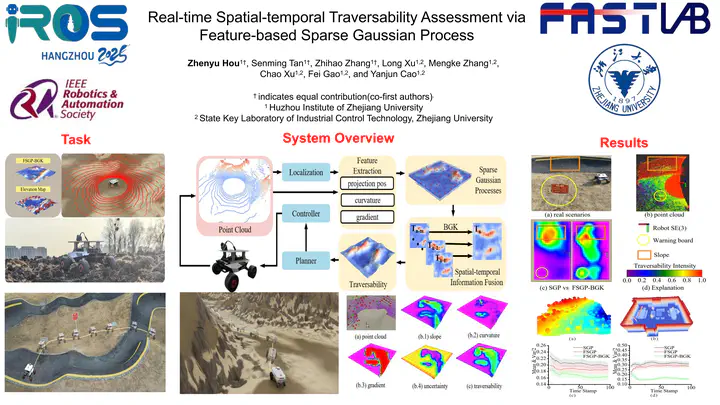 Terrain analysis is critical for the practical application of ground mobile robots in real-world tasks, especially in outdoor unstructured environments. In this paper, we propose a novel spatial-temporal traversability assessment method, which aims to enable autonomous robots to effectively navigate through complex terrains. Our approach utilizes sparse Gaussian processes (SGP) to extract geometric features (curvature, gradient, elevation, etc.) directly from point cloud scans. These features are then used to construct a highresolution local traversability map. Then, we design a spatialtemporal Bayesian Gaussian kernel (BGK) inference method to dynamically evaluate traversability scores, integrating historical and real-time data while considering factors such as slope, flatness, gradient, and uncertainty metrics. GPU acceleration is applied in the feature extraction step, and the system achieves real-time performance. Extensive simulation experiments across diverse terrain scenarios demonstrate that our method outperforms SOTA approaches in both accuracy and computational efficiency. Additionally, we develop an autonomous navigation framework integrated with the traversability map and validate it with a differential driven vehicle in complex outdoor environments. Our code will be open-source for further research and development by the community,https://github.com /ZJU-FAST-Lab/FSGP_BGK.
